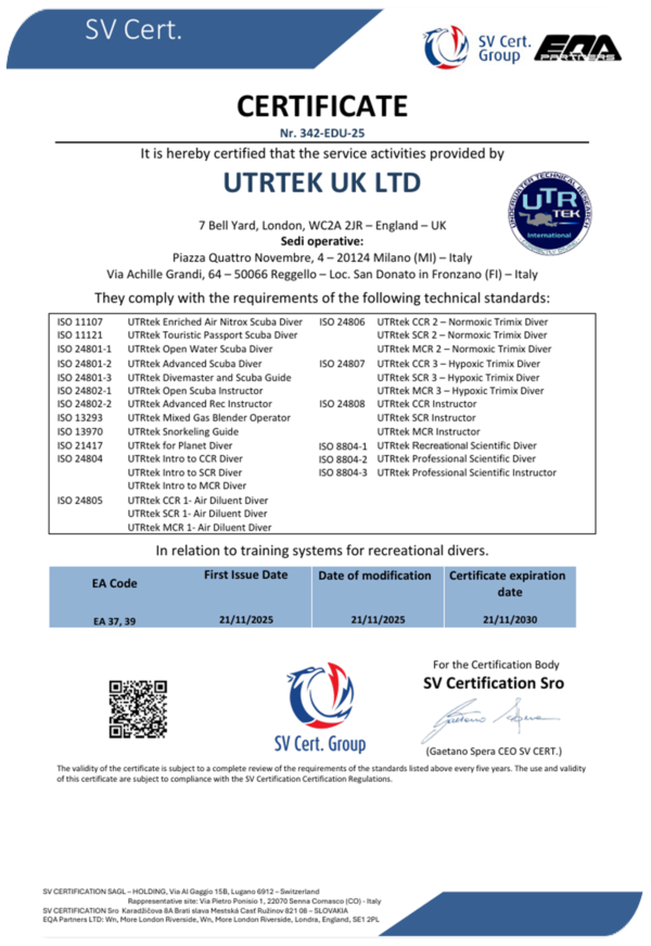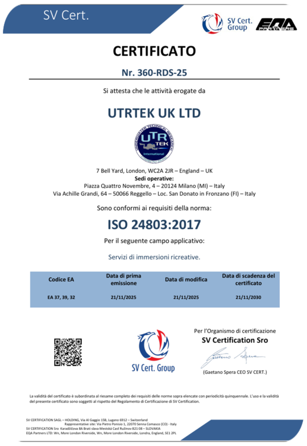 Servizi di certificazione di Istruttori e Divers per lo svolgimento di corsi subacquei